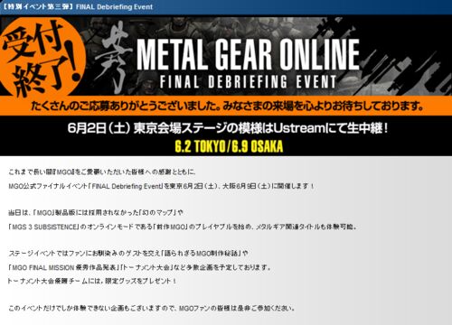 2008年からオンラインサービスが始まった【メタルギアオンライン】が 2012年6月12日をもってオンラインが終了する。 コナミがMGOのファン達に最後の感謝を込めてこんなイベントを用意した http://www.konami.jp/mgo/jp/hd/event/fw03_final_debriefing_ev…