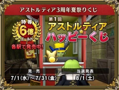 本日7月1日昼12:00よりアストルティア各大陸にて アストルティアハッピーくじが 販売される。 特等はなんと6億G! 限りなく当たる確率は現実世界の 宝くじと同じぐらいの低確率!! このゲーム内で たった1名のみ極めて当選するのは難しい ほぼ当たら…
