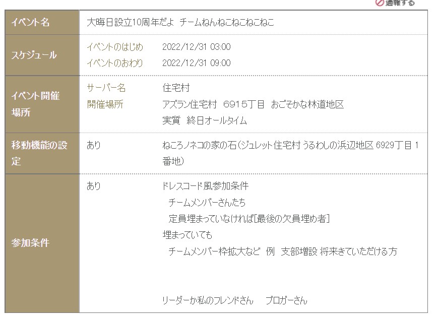 イベント名は「大晦日設立10周年だよ チームねんねこねこねこねこ」・・・身内でやるプレイヤーイベントかなにかかな?