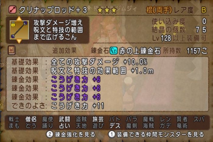 わかる人はすぐわかるとおもうけど仲間モンスター「いたずらモグラ」用だよ特技効果範囲+1.0mでの特技の「いたずらラッシュ」とめっちゃ相性いいから次の新武器が来る前にいたずらモグラをフィールドレベル上げ用に使う予定のある人は必須武器だよ!